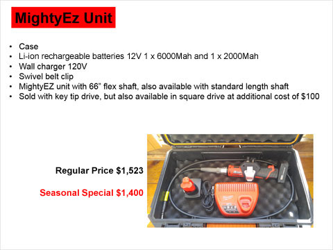 Questions, please contact Dr. Hyde at the above information. The MightyEz with flex shaft is a light weight battery powered unit, featuring an off/on switch, variable speed control and built-in clutch. The MightyEz gives you every feature you would expect in a regular motor, in a convenient cordless package. It is great for locations with no available power source, By alternating the use of the re-chargeable batteries, you can work all day.