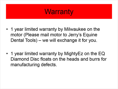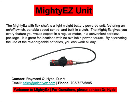 Questions, please contact Dr. Hyde at the above information. The MightyEz with flex shaft is a light weight battery powered unit, featuring an off/on switch, variable speed control and built-in clutch. The MightyEz gives you every feature you would expect in a regular motor, in a convenient cordless package. It is great for locations with no available power source, By alternating the use of the re-chargeable batteries, you can work all day.